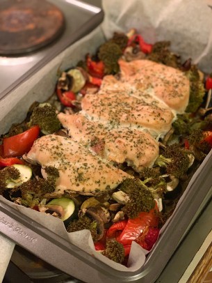 4. Cover with alfoil and bake until cooked through (about 30 minutes). Remove from oven when chicken is just cooked (as the veggies will be cooked underneath). Serve hot or use as meal prep to fill the freezer!