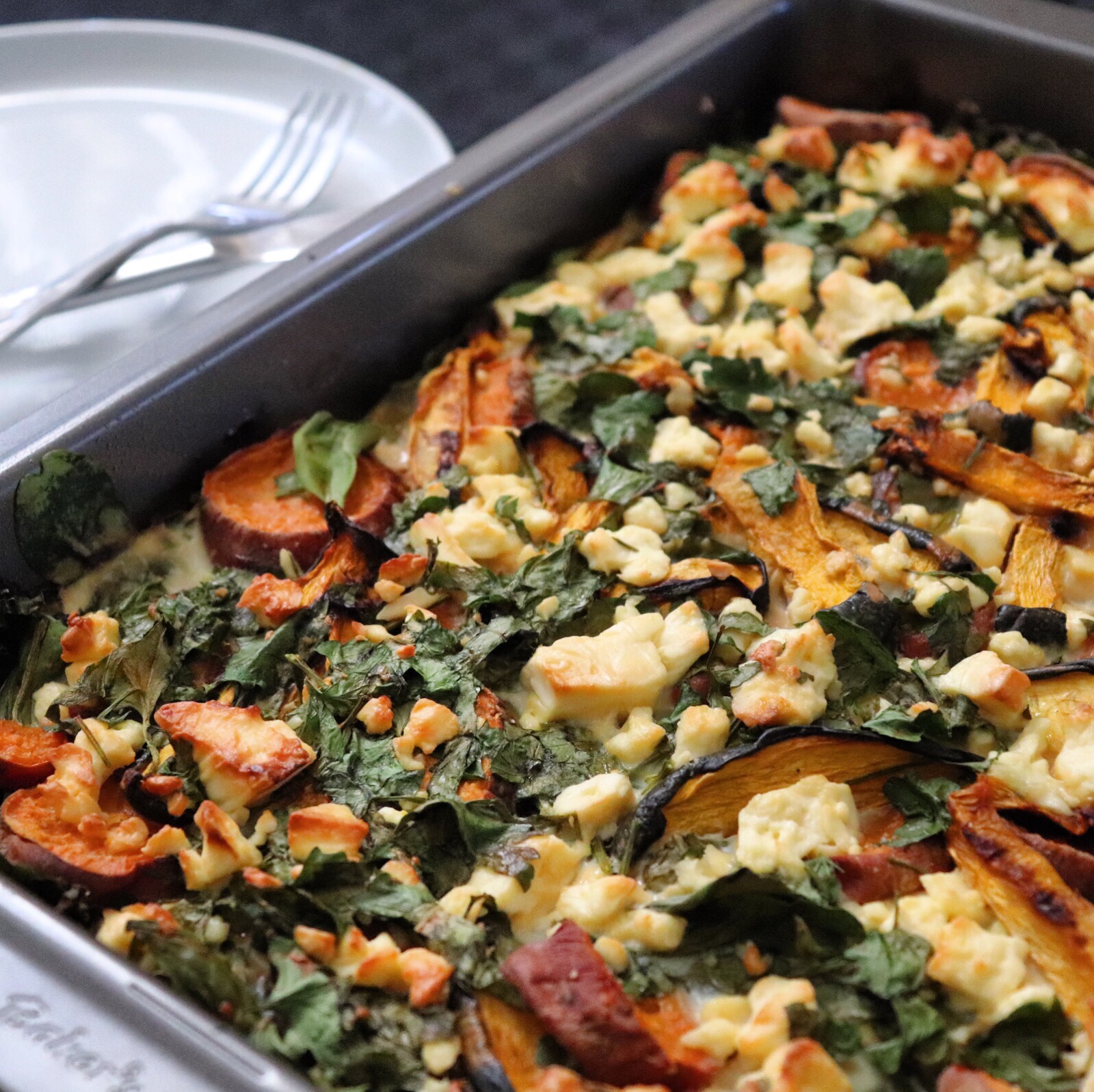 2. Chop the pumpkin and sweet potato into small pieces and roast until golden and soft (approximately 30 minutes).