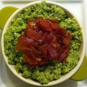 Red onion relish with broccoli pesto eggs