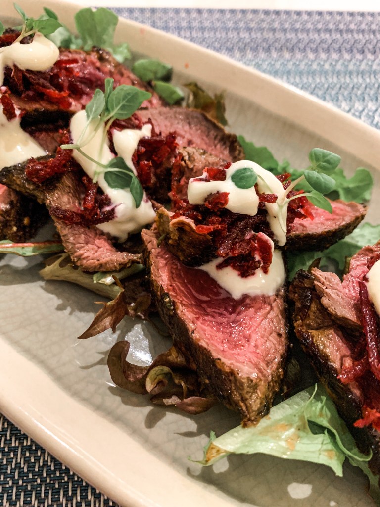 For entrée, I chose the kangaroo with dukkha crust, beetroot and lemon myrtle relish and yogurt mousse. I don’t usually like kangaroo as I find it to strong in flavour, but this was honestly the best one I’ve ever tried. Cooked medium rare and filleted quite thin, I think this stopped the ‘gamey’ flavour that you often find in kangaroo steaks. The beetroot wasn’t over-powering, nor the yogurt too creamy – it all balanced out perfectly. If kangaroo isn’t your thing, the salt and pepper crocodile may take your fancy (I’ve been told it tastes like chicken)…..