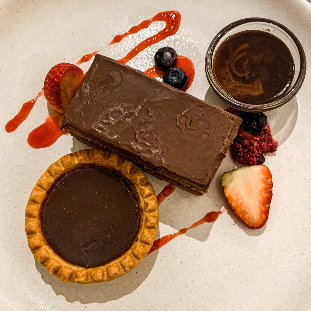 For dessert, I attempted to eat the ‘Chocolate Sin’. I say attempted because I was overpowered by the portion sizes. I wasn’t expecting a full sized chocolate tart AND mousse cake to arrive, dressed with berries and chocolate ganache no less. They were amazingly wonderful but I just had no room left!
